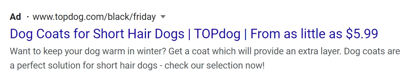 This is what a typical search ad would look like in Google search results for people who are looking for a way to keep their dogs warm: