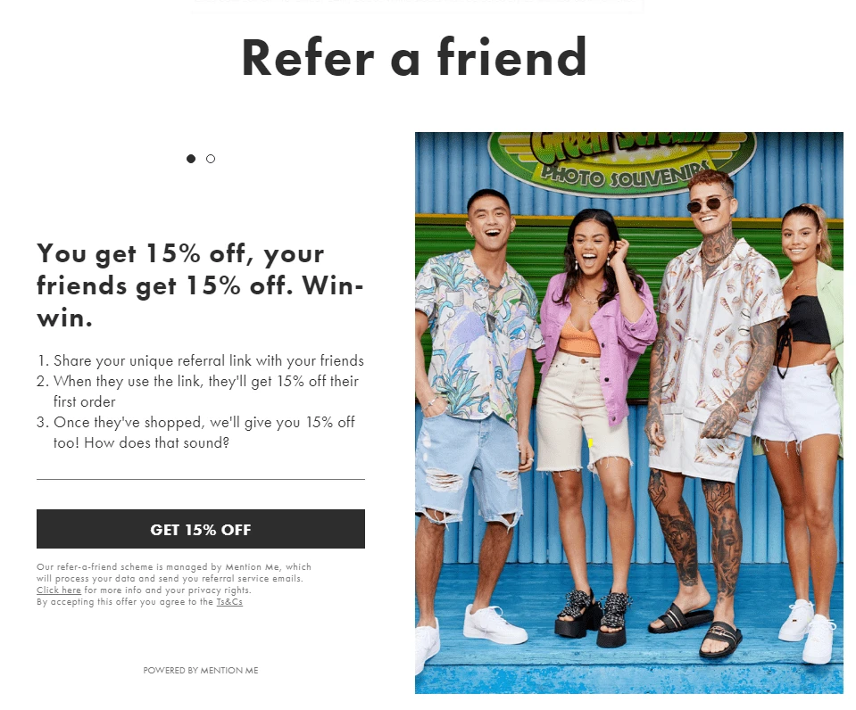 Finally, ASOS, a popular e-commerce clothing brand, offers discounts as referral rewards. Both the referral and the friend receive 15% off when buying from the ASOS online store, so it’s a win-win situation.
