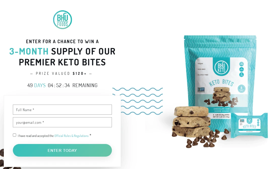 Similarly, Bhu Foods, an e-commerce company selling healthy snacks, used a contest to encourage happy customers to refer friends. The big prize was three months’ worth of Keto Bites supplies, significant enough for users to share the opportunity with other friends.