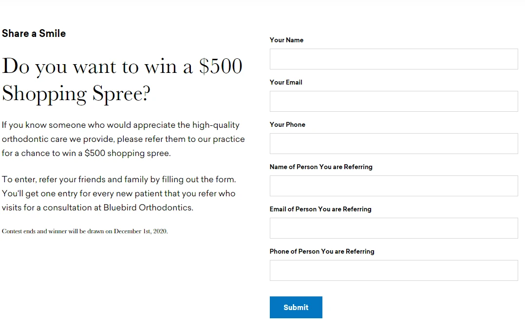 You wouldn’t expect to see a referral contest in the dental industry, right? Wrong! Bluebird Orthodontics, a B2C service company, used this strategy to attract new customers.