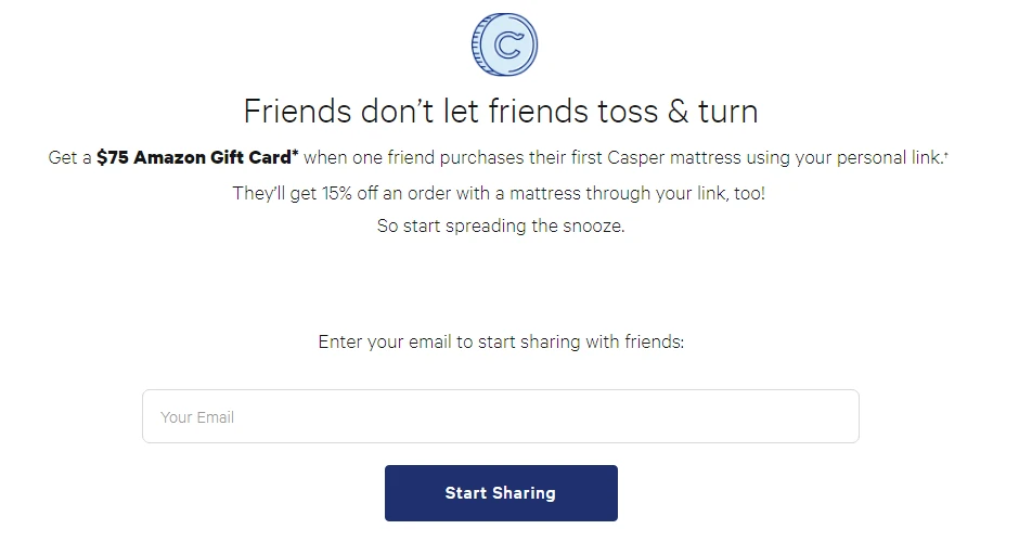 Casper, an e-commerce firm that sells mattresses, offers $75 Amazon gift cards to their customers when their referred friends purchase their first product using a personal referral link. The referred user also gets an incentive: 15% discount on their first order. Quite tempting!