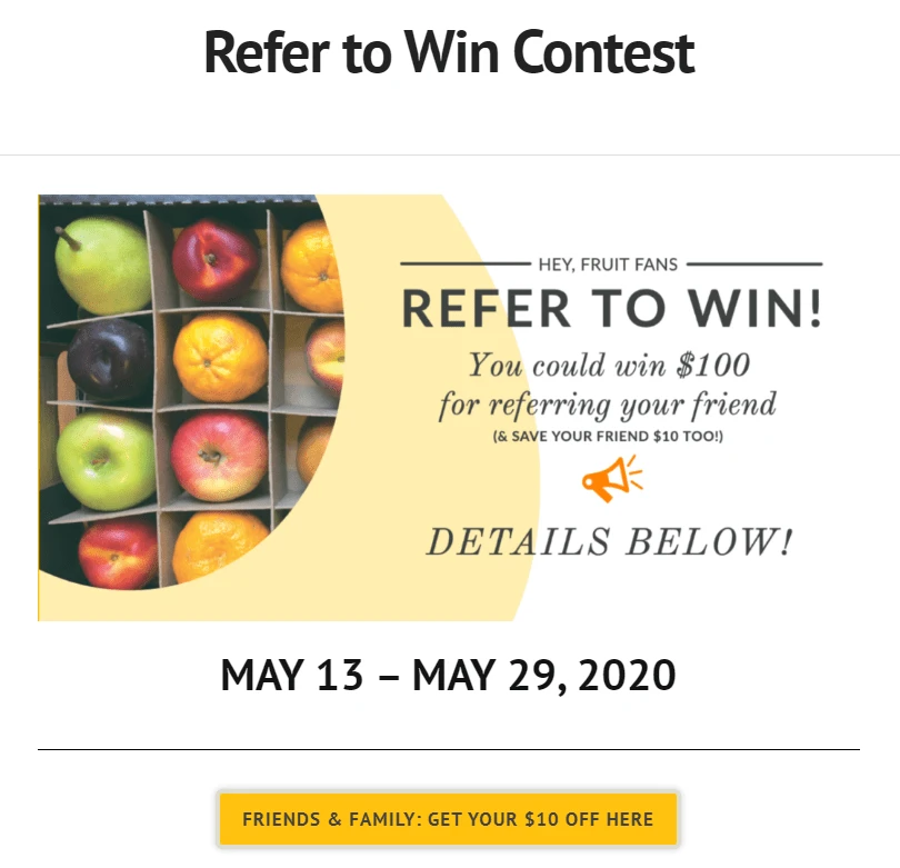 Let’s stay in the health niche and look at another example, this time coming from a fruit delivery service. FruitGuys ran a referral contest this summer, offering a $100 reward to the winner.