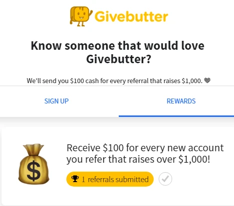 Givebutter, a fundraising platform, opts for cash rewards as well, but their referral prizes are much higher. For every referral that raises $1000 on the platform, the existing customer receives $100 in cash.