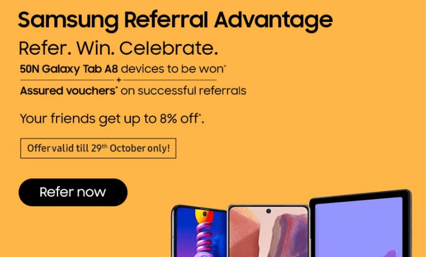 Finally, Samsung organized a referral contest where the big prize was a Galaxy Tab A8 device. Along with this referral reward for the winning customer, the company offered 8% discounts to the friends they referred.