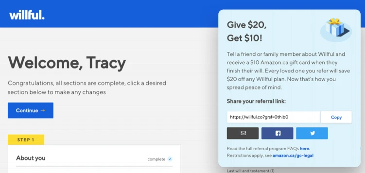 Their incentives are also double-sided: the customers receive $10 in Amazon gift cards, while the referred potential customers get $20 off any Willful plan. The company offers financial services, and their referral program encourages professionals to refer their clients to this innovative online will solution.