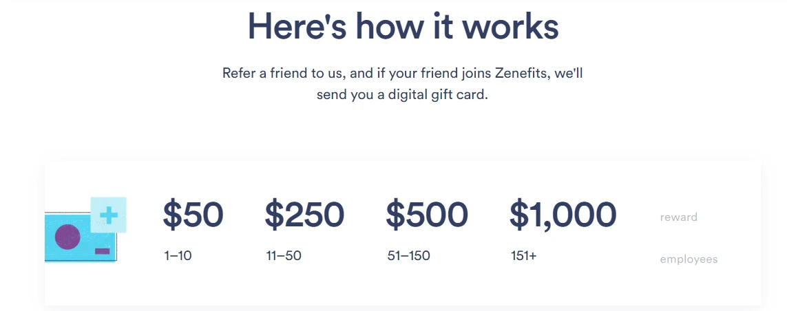 Zenefits, a human resources software company, uses a slightly different goal-based system. Their referral program offers cash rewards based on the number of employees of the referred firms. For instance, if the referred firm has between 11 and 50 employees, the referral receives $250 in cash!