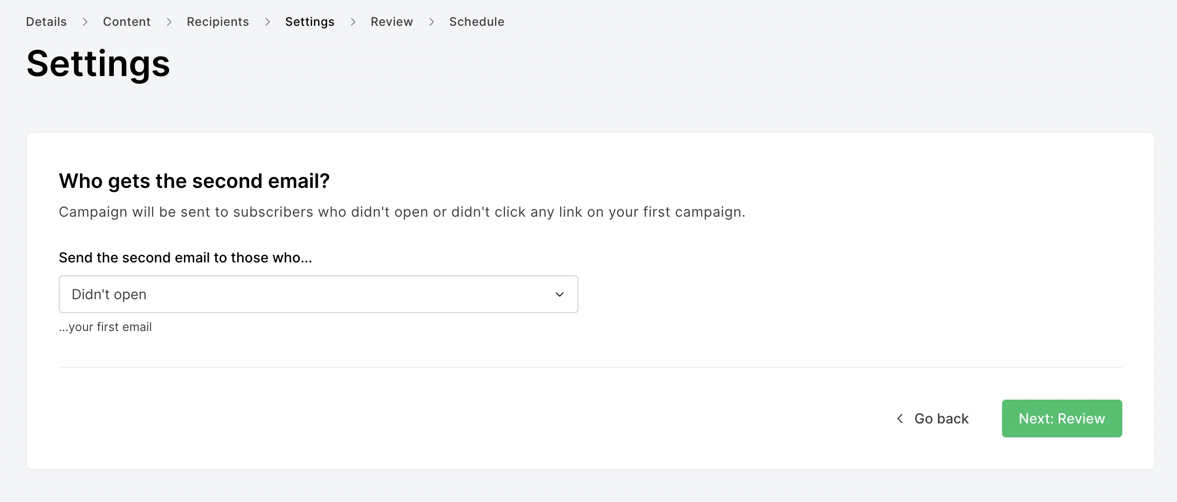 After you finish creating your content, it’s time to select which subscribers will receive the Auto resend campaign. You can choose those that did not open the first email or those that did not click on a single link.