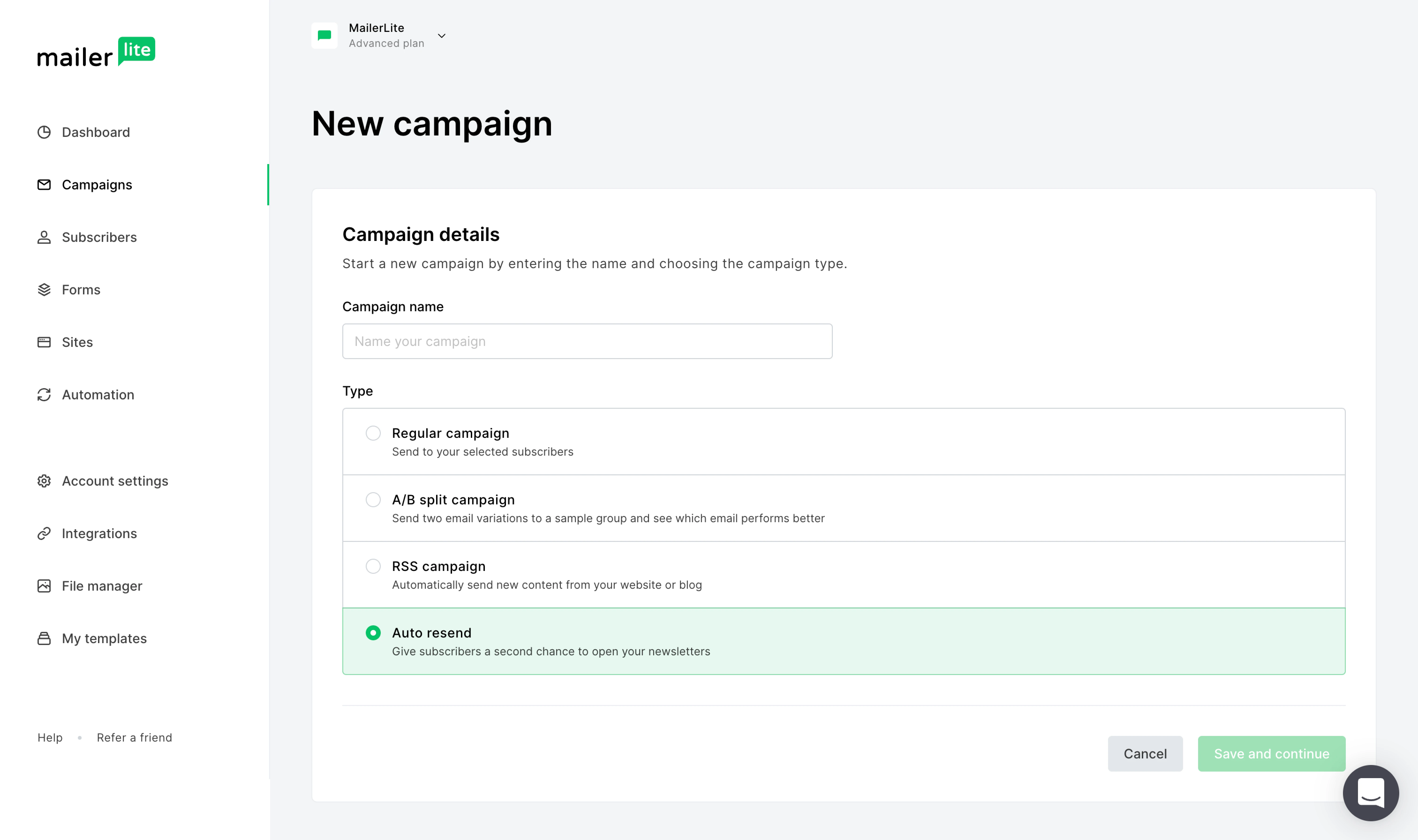 Start by clicking Create new campaign and selecting the Auto resend tab.