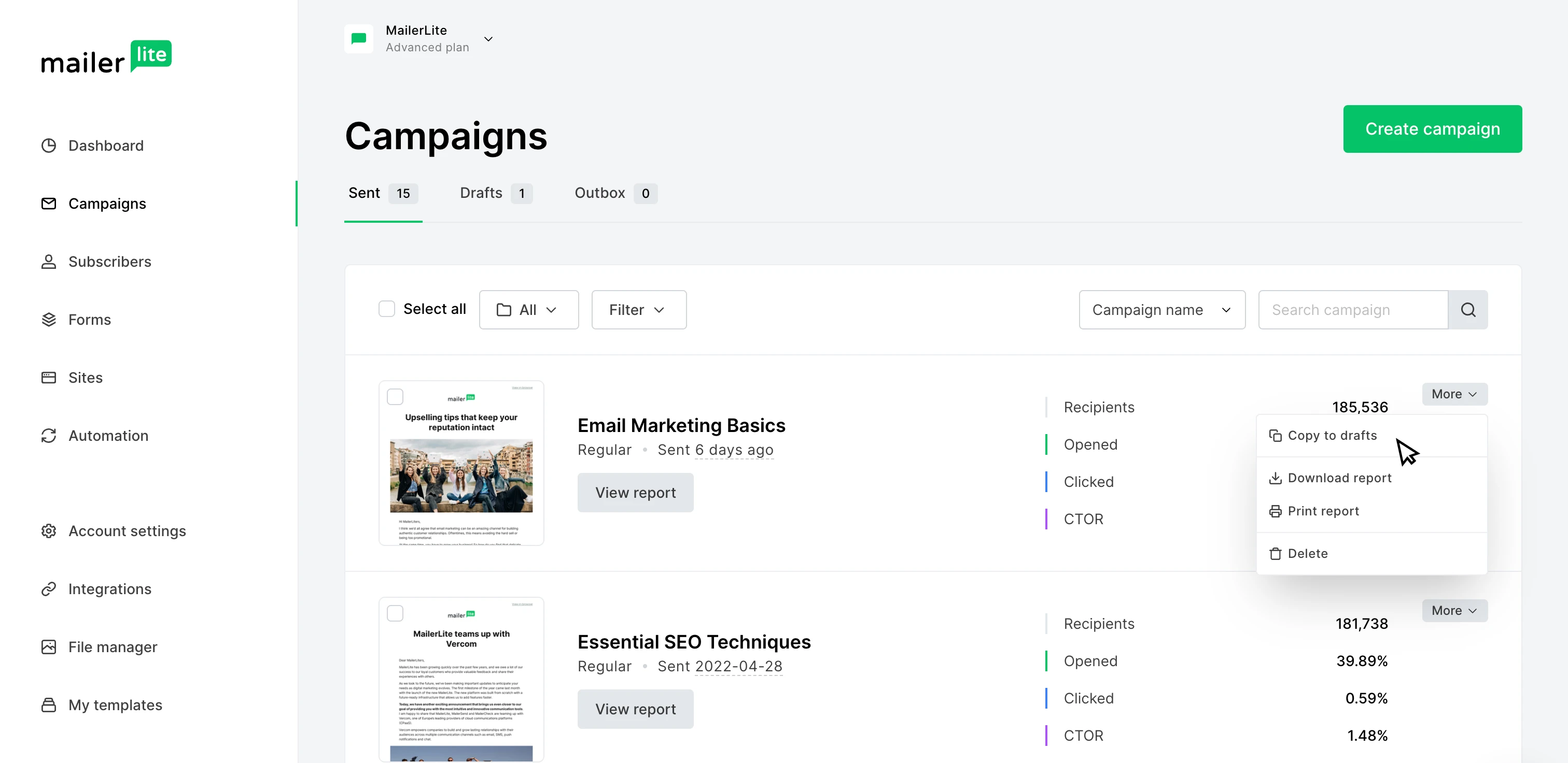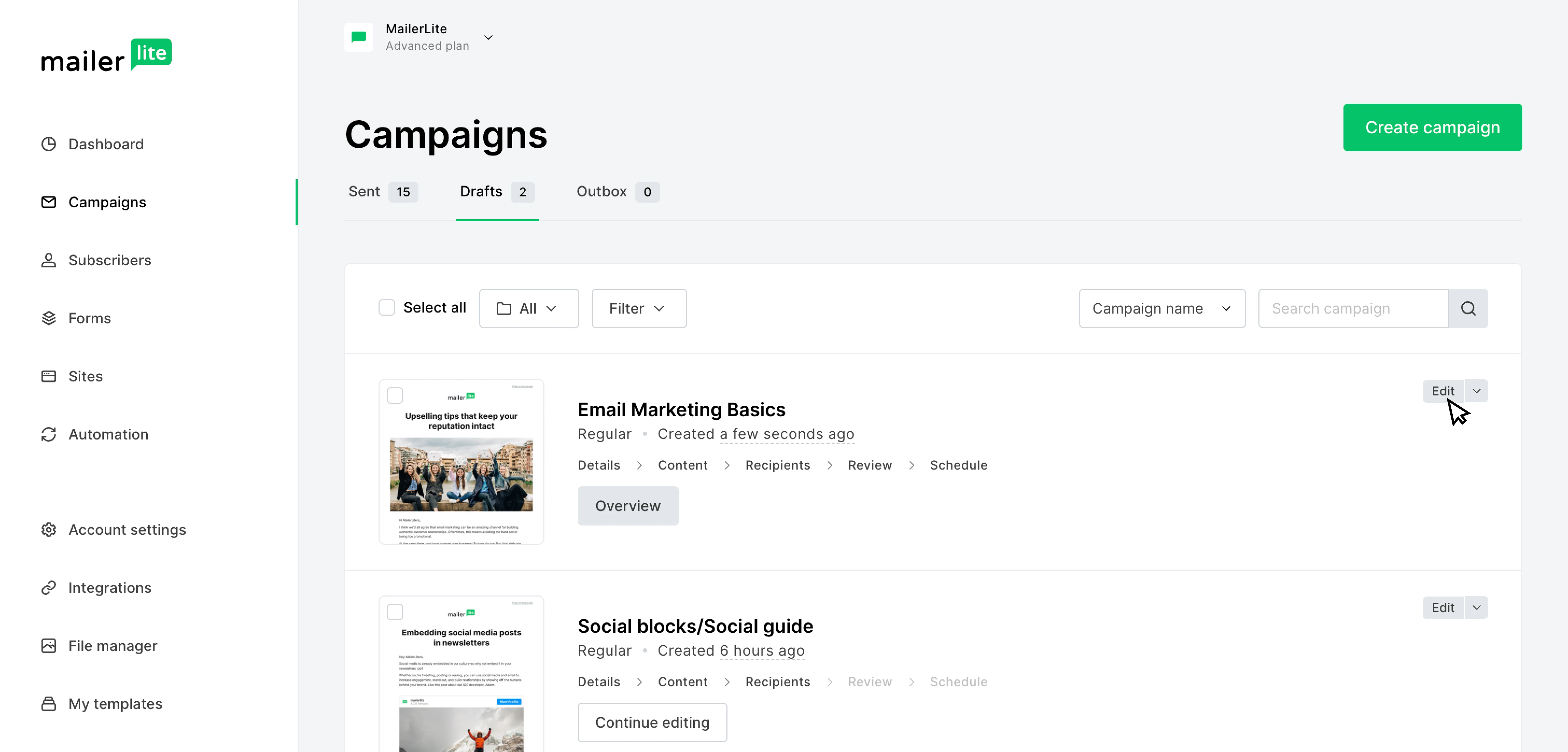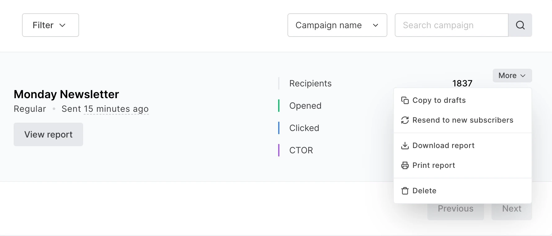 MailerLite will then send your newsletter to all new subscribers. You can resend your campaign multiple times, which is useful if you get a lot of subscribers throughout the week. To do this, select the resent campaign and then repeat the steps listed above.
