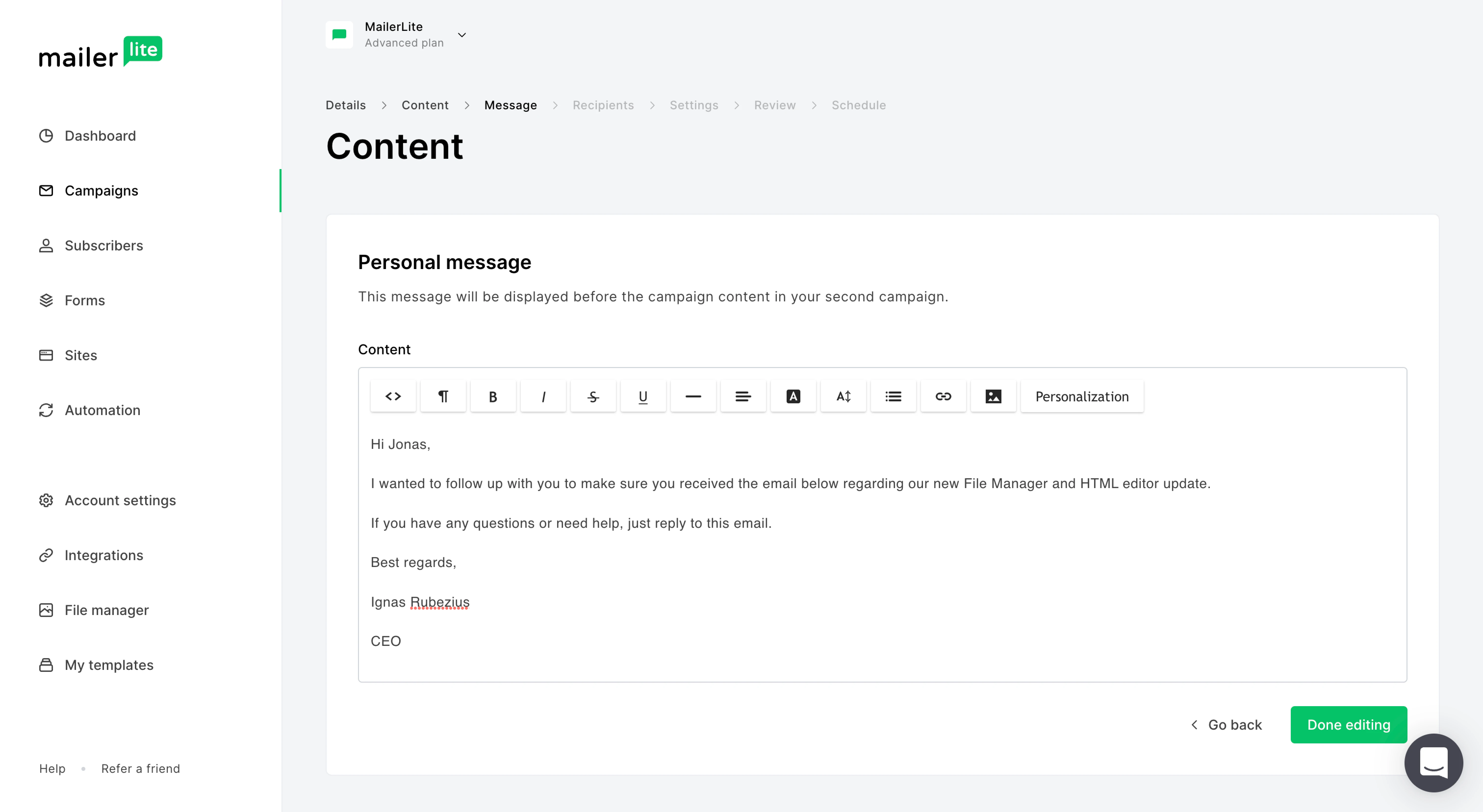 Adding a personal message in MailerLite is very simple. The trickier part is deciding what to write in your message. This is how we found success with this auto resend option.