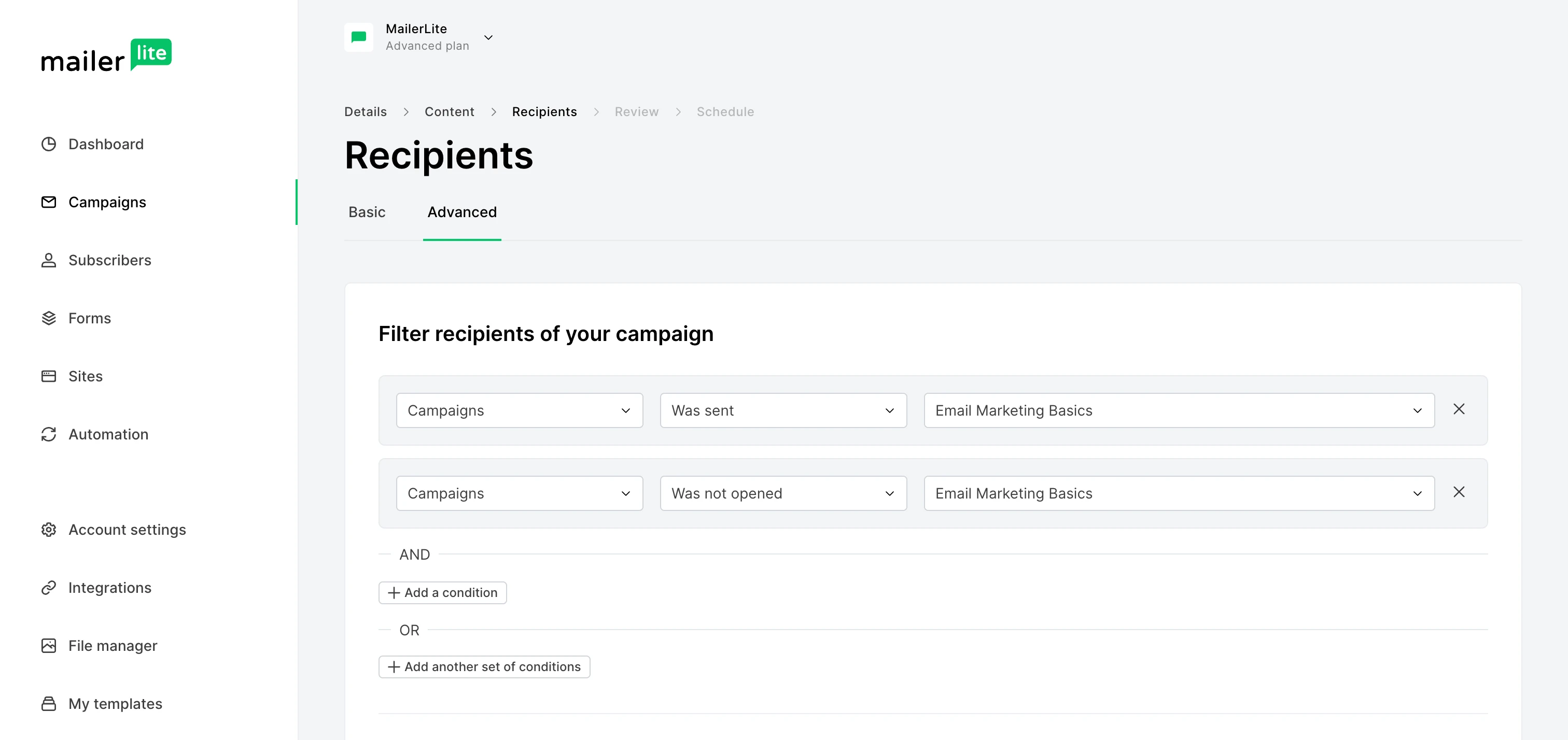 Instead of selecting a group or segment, you’re going to use the Advanced option. Here you can select your recipients based on multiple filters.