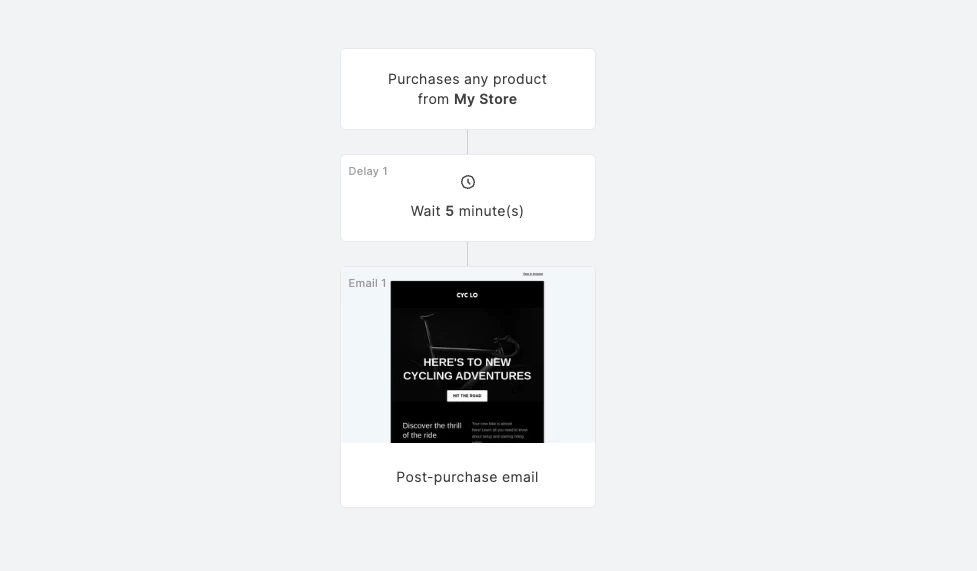 Meanwhile, the Purchases any product trigger can be used to follow up with general post-sales messaging that all buyers will benefit from, like review requests, referral emails, or customer surveys.