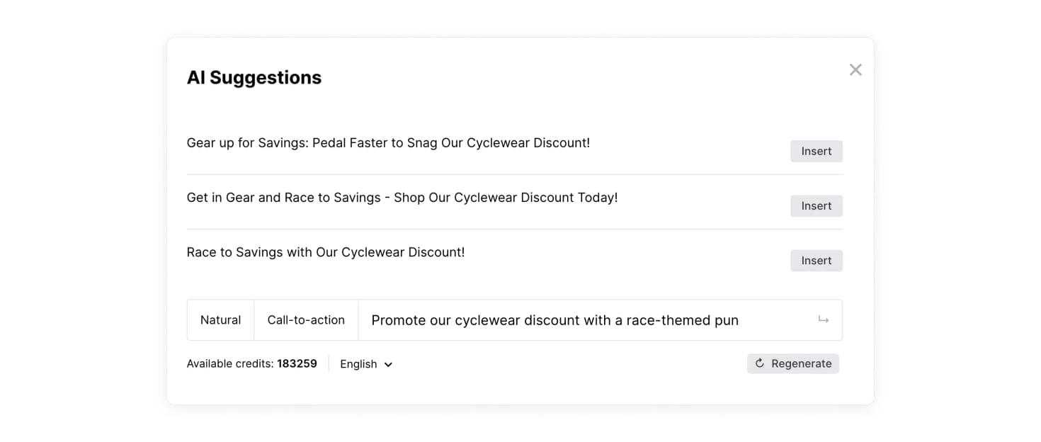 But if you need some inspiration, ask our AI writer to come up with some for you. Provide details about your offer and theme and the tool will provide suggestions in seconds!