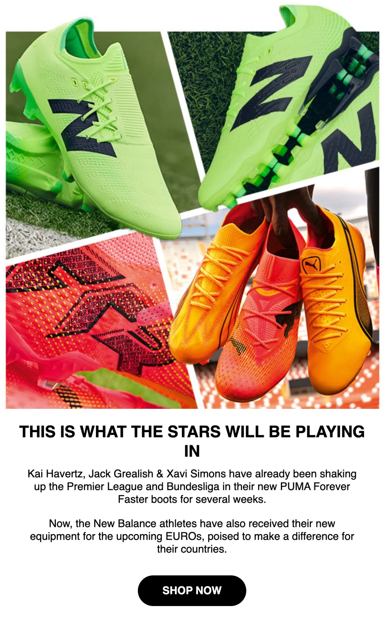 Unisportsstore highlighted the cleats players will wear at the Euro 2024 soccer championships, but you could easily do something similar for any major football event or other global sports competition.