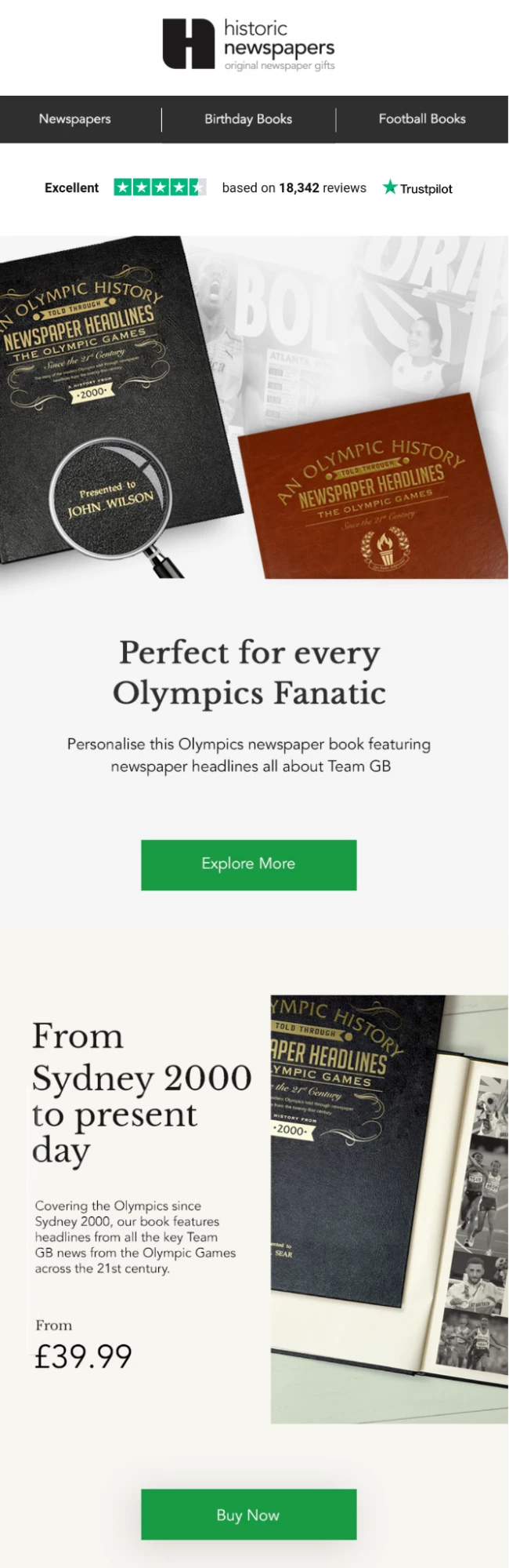 Historic Newspapers has an interesting take on the theme. They created a special summer games-themed book filled with relevant headlines from history. This is an excellent example of a non-sports brand leveraging the event's theme.