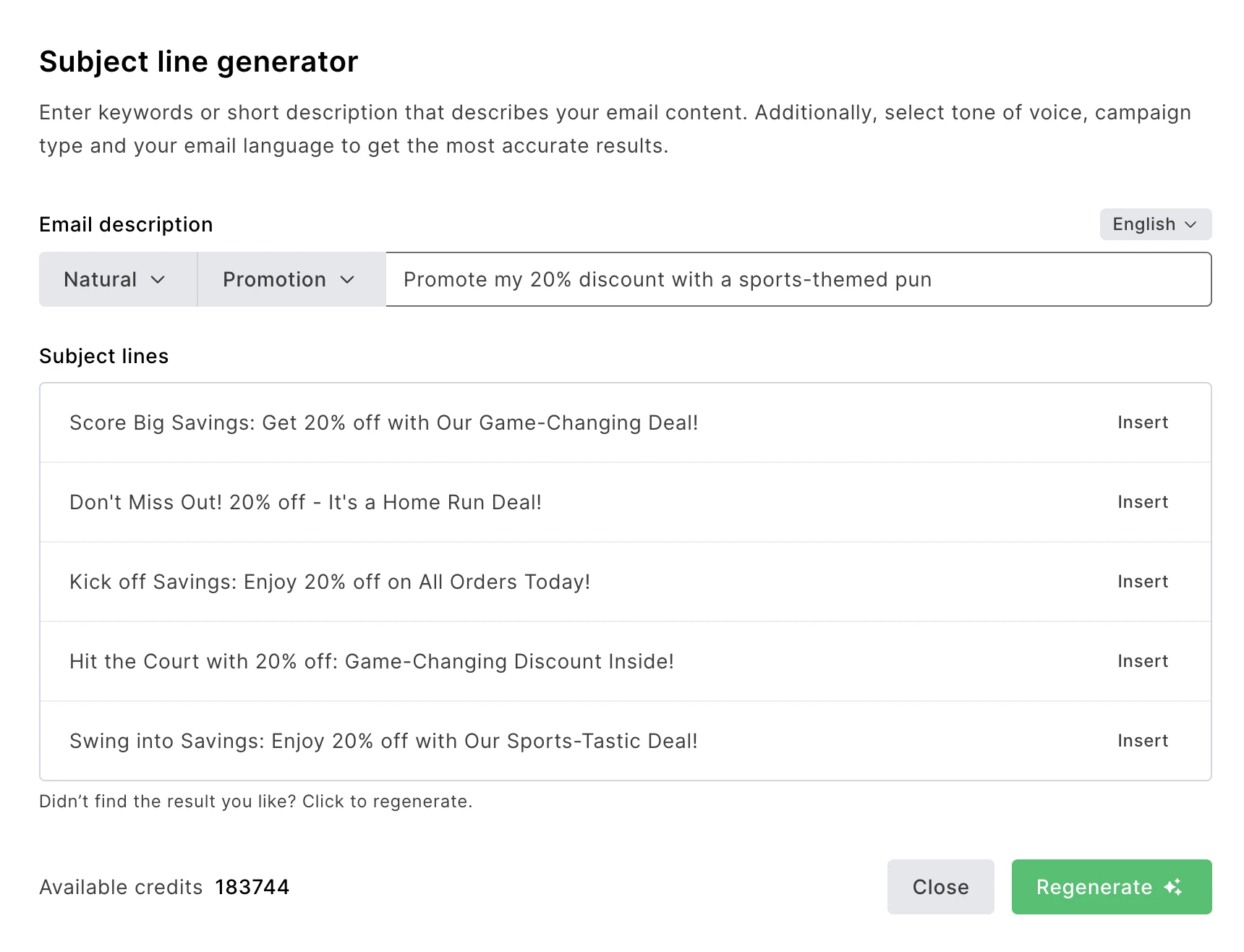 For more subject lines, use our AI generator to create themed subject lines tailored to your messages. Just tell it what you want your message to be about, and it will create options based on your input.