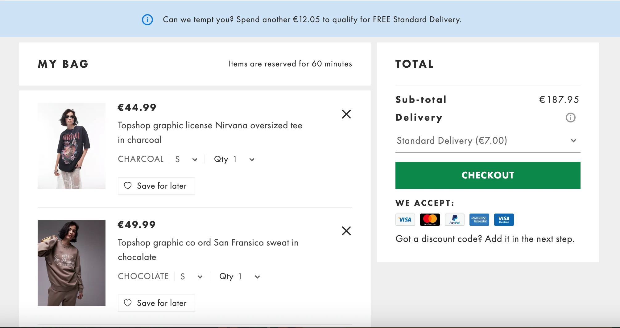 You can use free shipping indicators anywhere on your website, but they are most commonly placed in the shopping cart or checkout. It’s also a good idea to let people know how much shipping will cost if they don’t reach the free shipping amount. If shipping costs the same or more than the remaining amount, in many cases, people will find a similarly priced item and add it to their cart rather than pay the shipping costs.