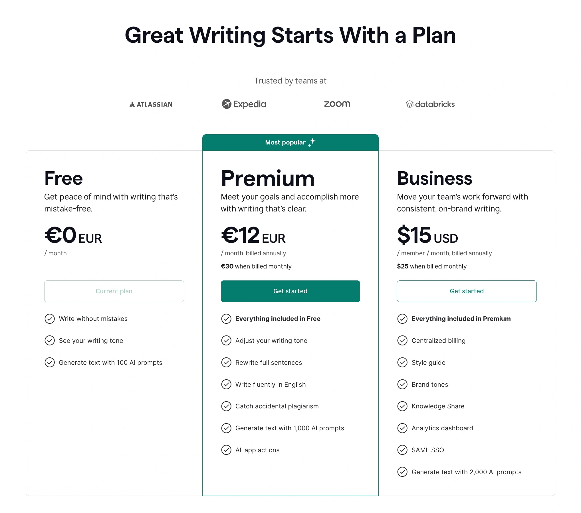 You don’t have to go overboard though. Grammarly takes a quieter approach to social proof by highlighting its most popular offer and including the logos of well-known clients.