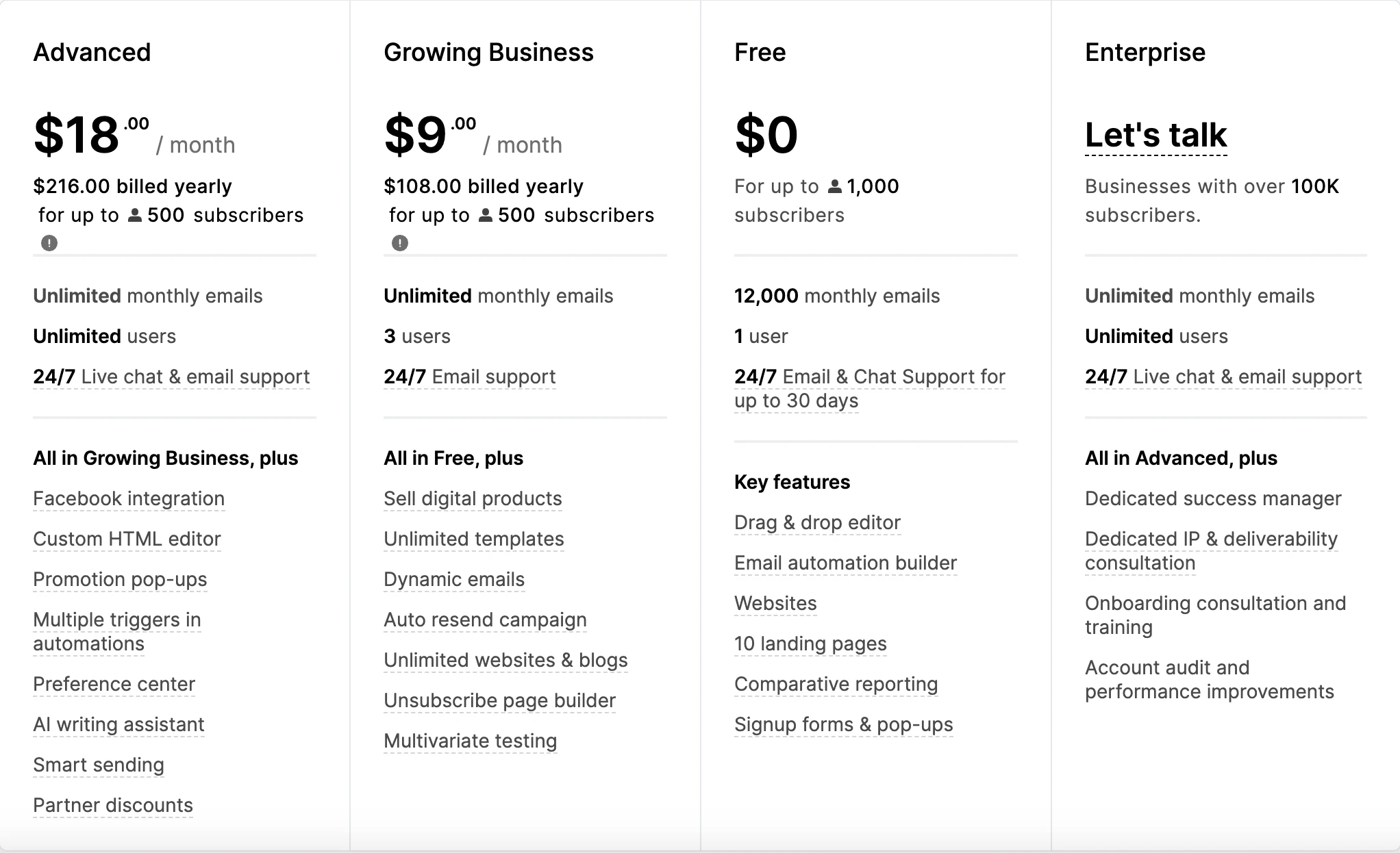 Take the MailerLite pricing page for example. In one glance you can easily review the different prices and compare the value of each plan.