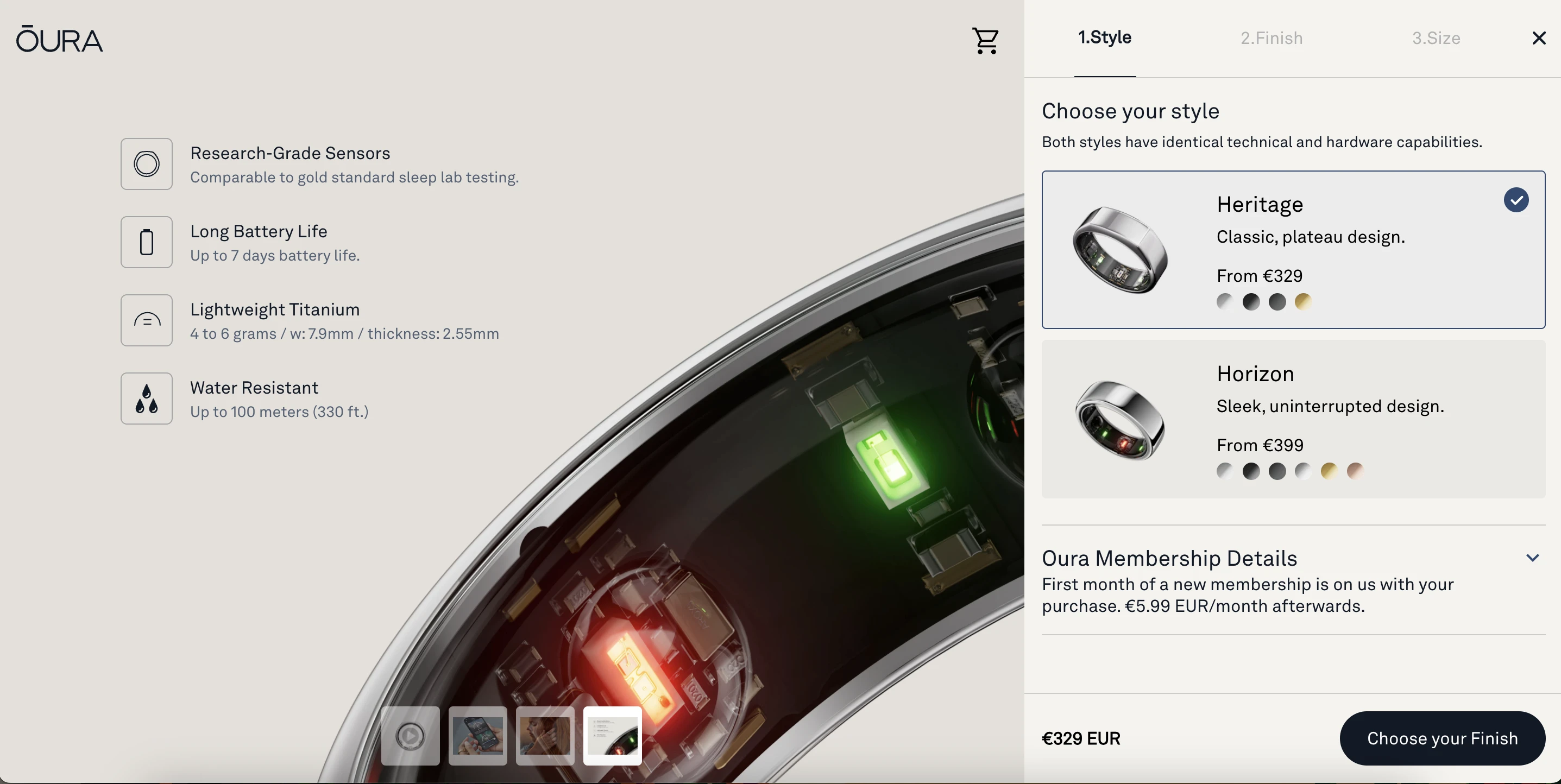 Let’s take the Oura ring as an example. When purchasing the ring on the Oura website, the price margin between the Heritage style and the Horizon style is 21.3%. Even though it’s a higher ticket item, it follows the general guide of keeping to around a 20% price margin.