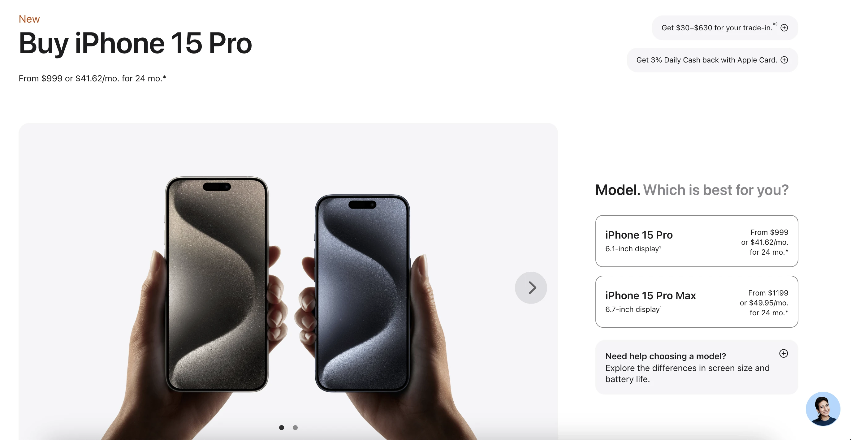 Apple uses a simple upsell strategy that makes it super-easy to say “yes”: When you search for an iPhone 15 Pro on their website, you can immediately compare it with the iPhone 15 Pro Max and upgrade your purchase in one click.