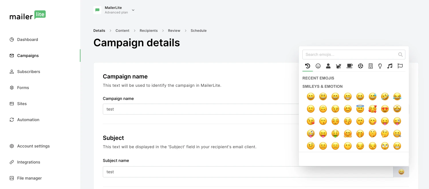 When you’re using MailerLite, adding emojis to your subject line is super duper easy. You don’t need to go to any online emojipedia and start copy/pasting the right emoji, instead just click on the 😀 emoji in the subject line field. This automatically opens an emoji keyboard.
