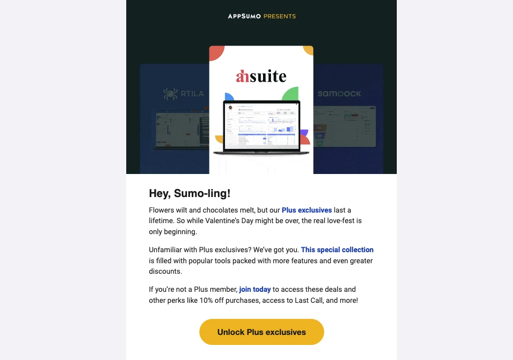 In this example, AppSumo reminds its users that while Valentine’s Day is over, the company still has lots of love to give its customers. It promotes its year-round Plus membership while using fun copy to tie the offer into the Valentine’s Day theme.