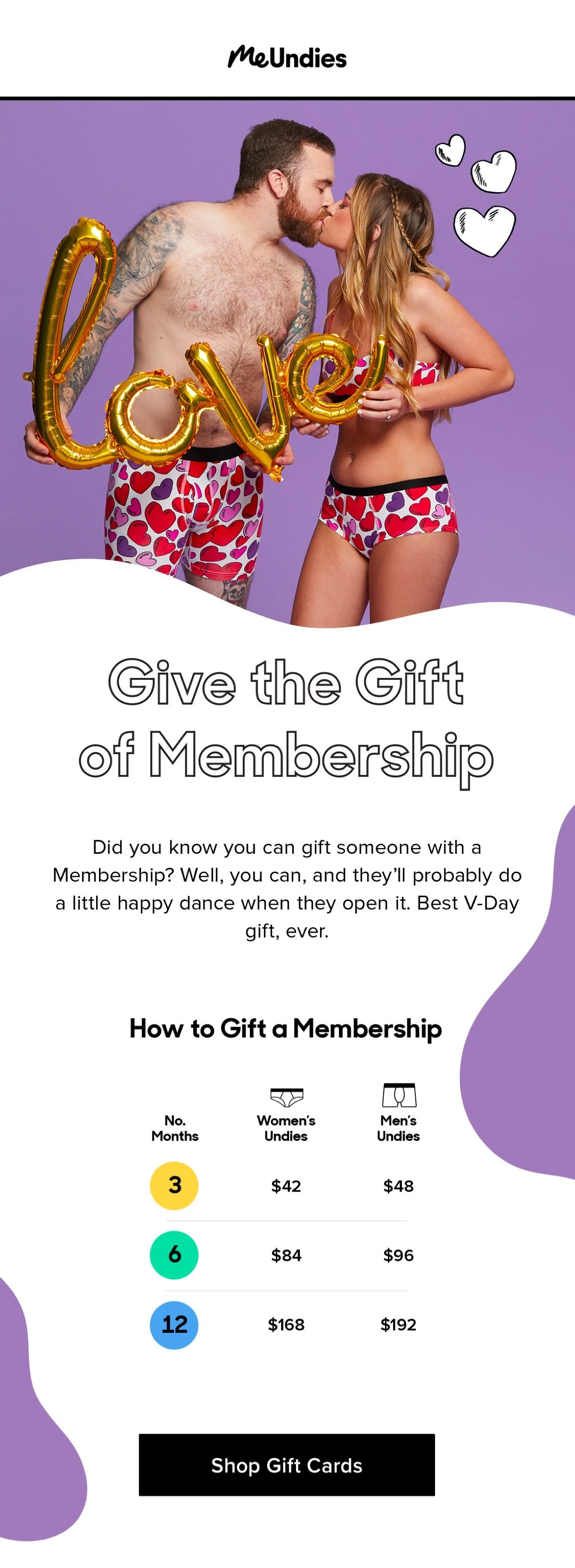 We’re big fans of this email marketing campaign by MeUndies, which encourages people to buy a Valentine’s Day gift card that gives the recipient a new pair of undies every month! The fonts and color scheme are clean and coherent, and the email copy is fun and clearly explains what MeUndies is all about.