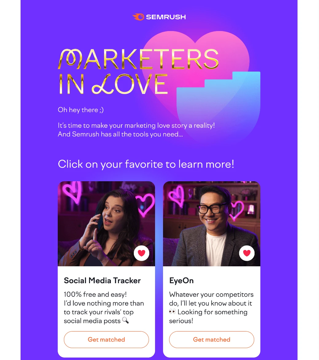 Semrush is a marketing software tool: probably not the Valentine’s Day gift most people are hoping for. But the company still sent out a Valentine’s Day “Marketer’s in Love” series where the team introduces the features they like the most.