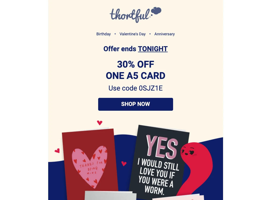 Greetings card retailer Thortful sent emails on February 12 and 13 reminding people that they can still buy their card and have it arrive on time with next-day delivery. The company combined this reminder with a 30% discount to make the offer extra enticing. There really was no excuse for subscribers to not buy their card in time!