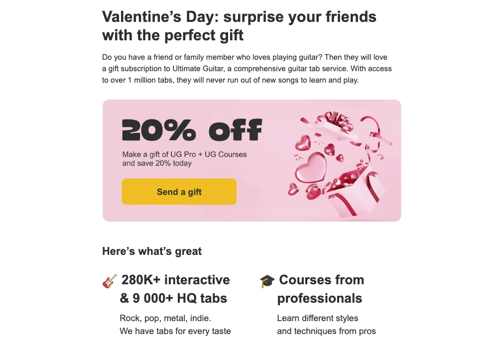 Ultimate Guitar does this successfully with a one-day-only 20% discount on its library of guitar tabs and courses. You can only get the offer if you sign up on the day you receive the email.