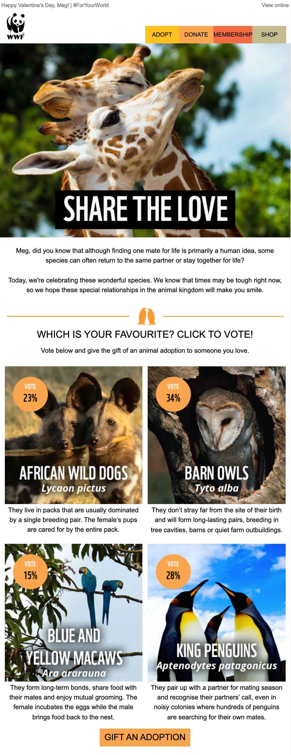 In the email example below, the nonprofit WWF asks its readers to vote for their favorite relationships in the animal kingdom!