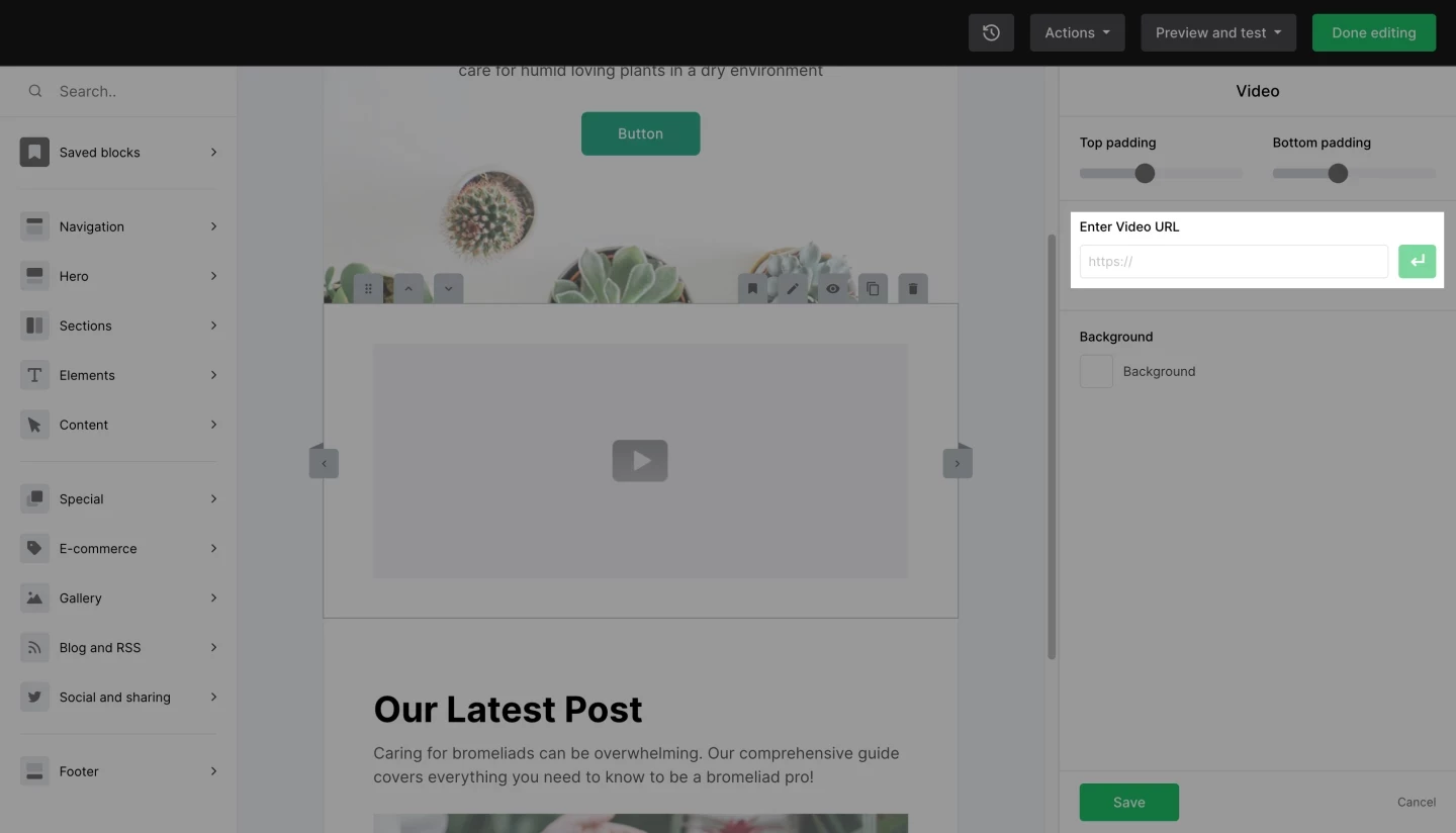 To add a video to your new video block, click on the block to select it. Then in the right-hand sidebar, enter the share URL of the video you wish to embed in your newsletter and click the green return icon.