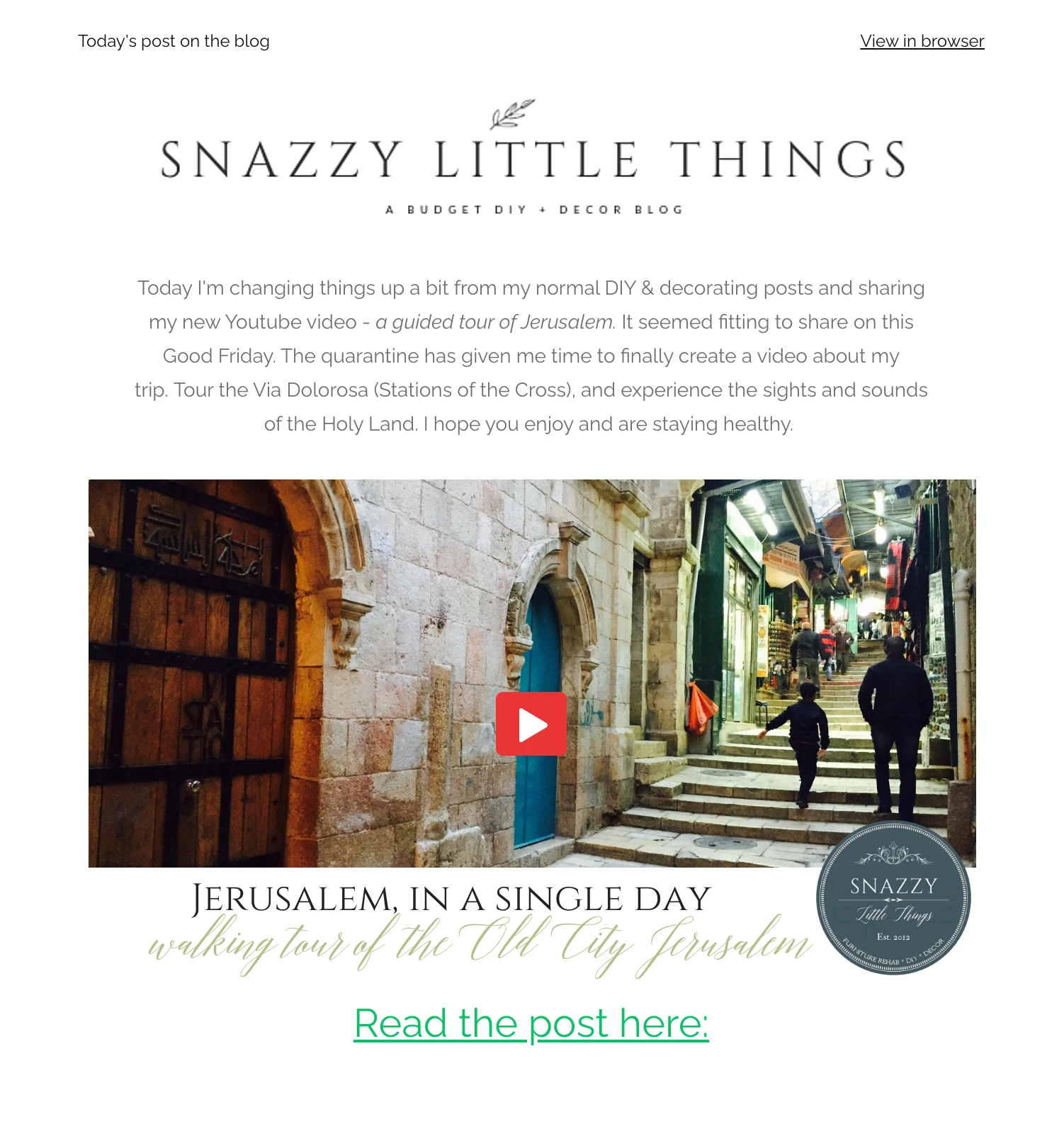 Created by Jeanette, Snazzy Little Things is a beautiful and inspiring decorating and DIY blog. In this video email example, she uses a stunning static image from her trip to Israel for her video thumbnail that entices the subscriber to click through and watch the video.