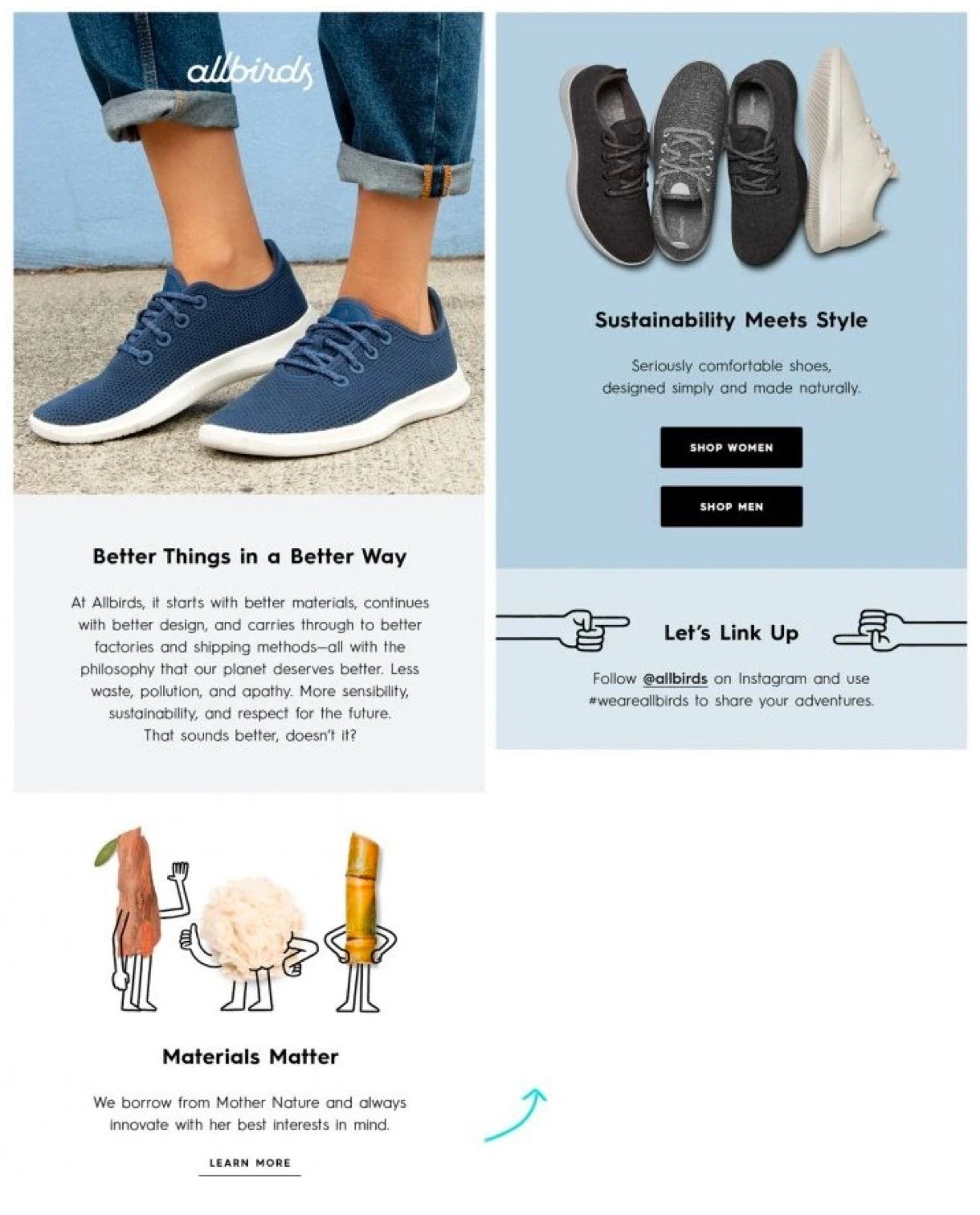 Complementary colors and design: The email is designed in a cool and colorful way with blue and brown tones, which enhances the product image. Having a photo of the shoes and entertaining illustrations makes Allbirds come across as a friendly brand.