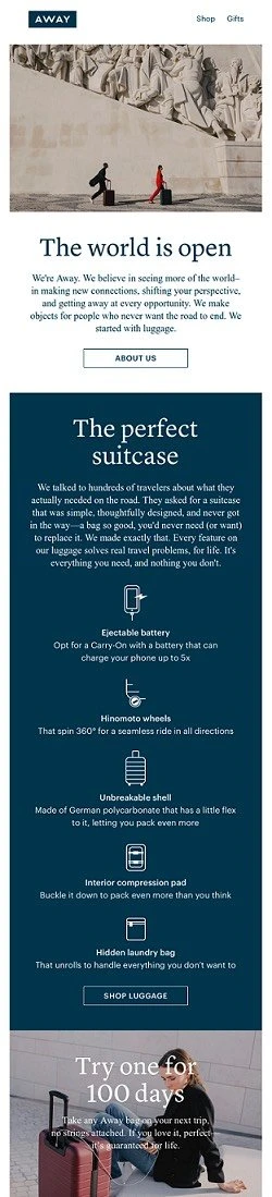 Brand story: Away Travel uses their inaugural email as an opportunity to tell their audience how their product originated. They surveyed their audience about their bag problems and used the feedback to make the perfect suitcase.