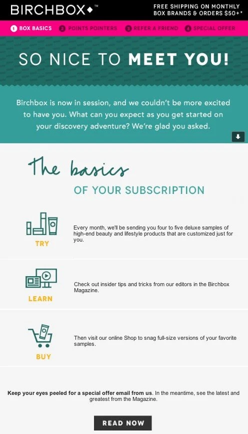 Birchbox, a New York City-based monthly subscription service, has another admirable welcome email.