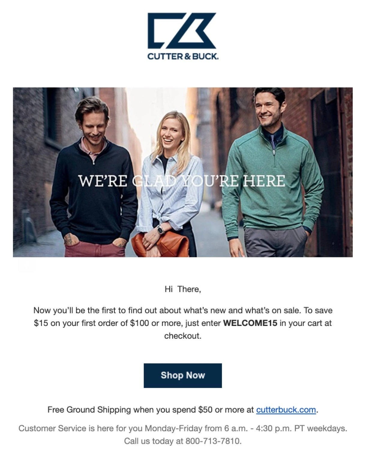 Simplicity: The messaging is simple and straightforward. From the direct body messaging “We’re Glad You’re Here” to the plain call-to-action “Shop Now”, the messaging is easy for recipients to understand.