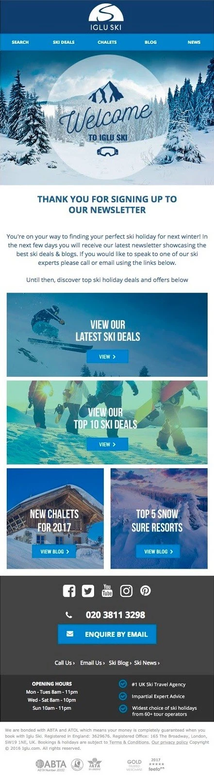 Iglu Ski, a U.K. travel agency that specializes in ski vacations, has an excellent welcome message that’s worth talking about.