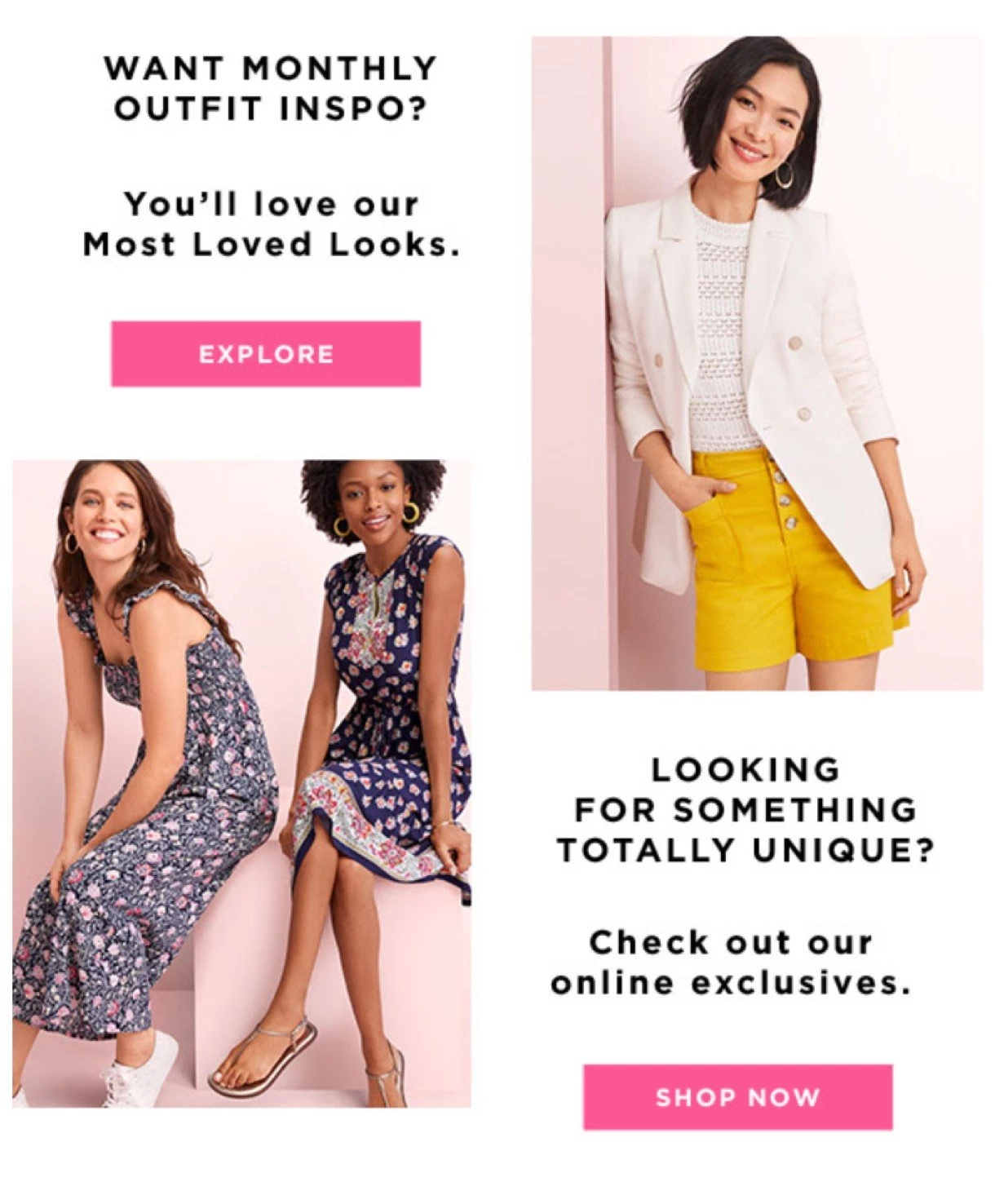 For example, women’s clothing store, Loft, showcases their “most loved” looks in a welcome email to help potential customers discover all of the different outfits and accessories they can put together.