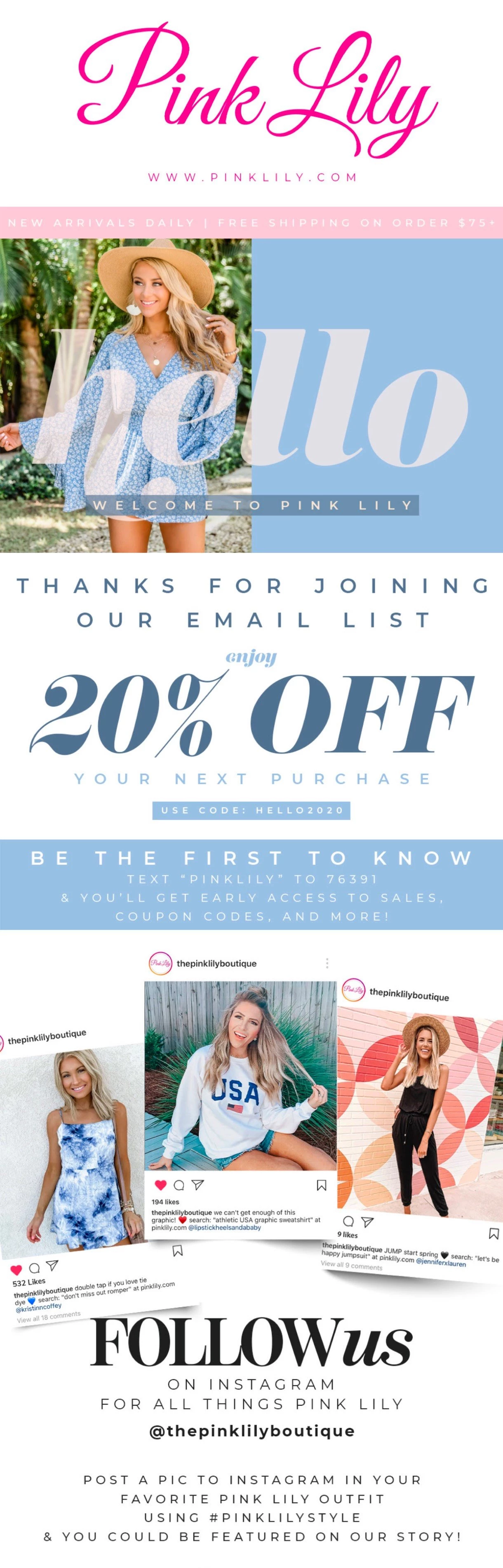 Pink Lily uses a quick-action welcome email by asking you to follow them on their Instagram account.