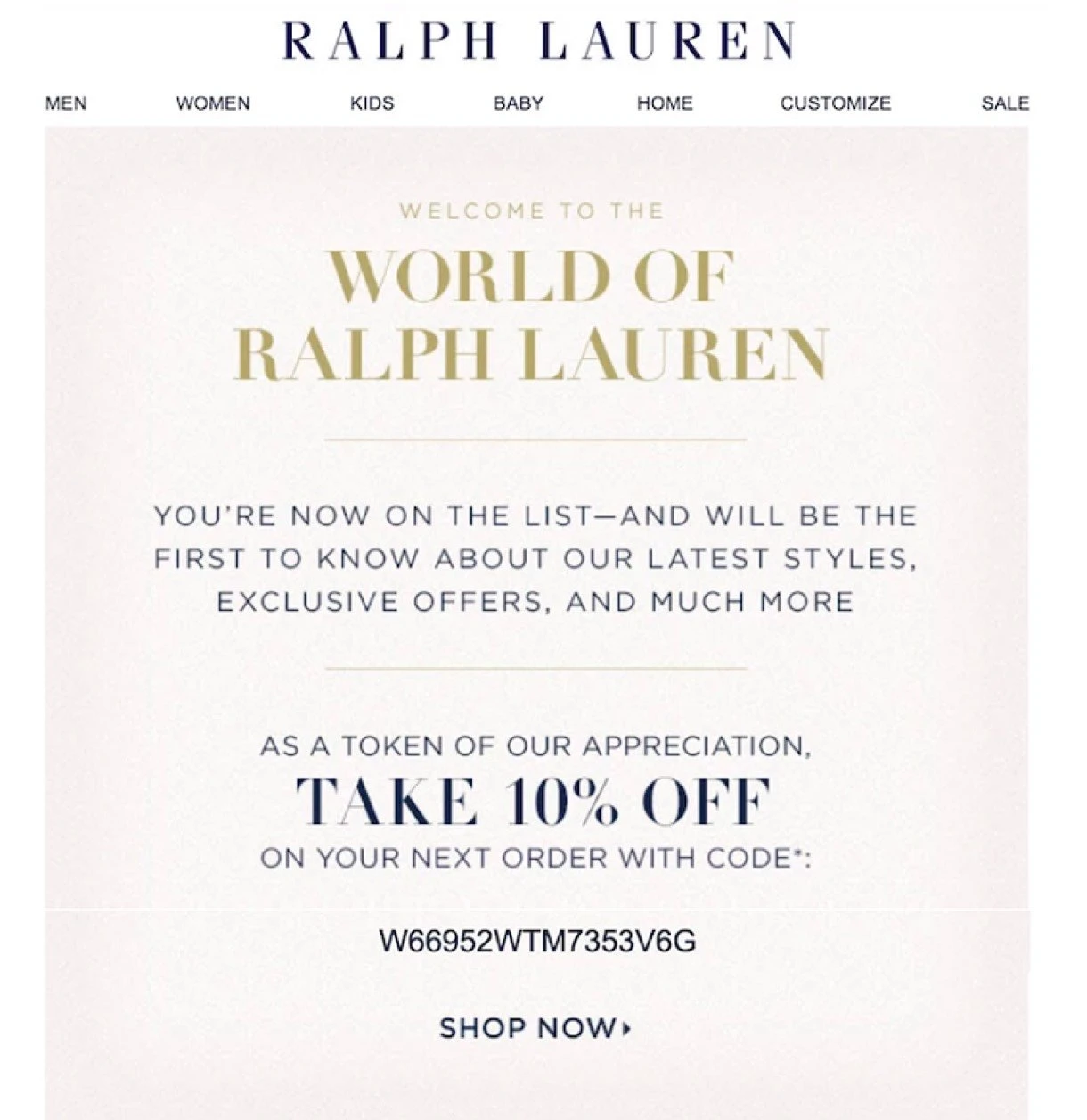 Coupon codes: Ralph Lauren uses unique coupon codes to encourage customers to take advantage of a discount and buy their products.