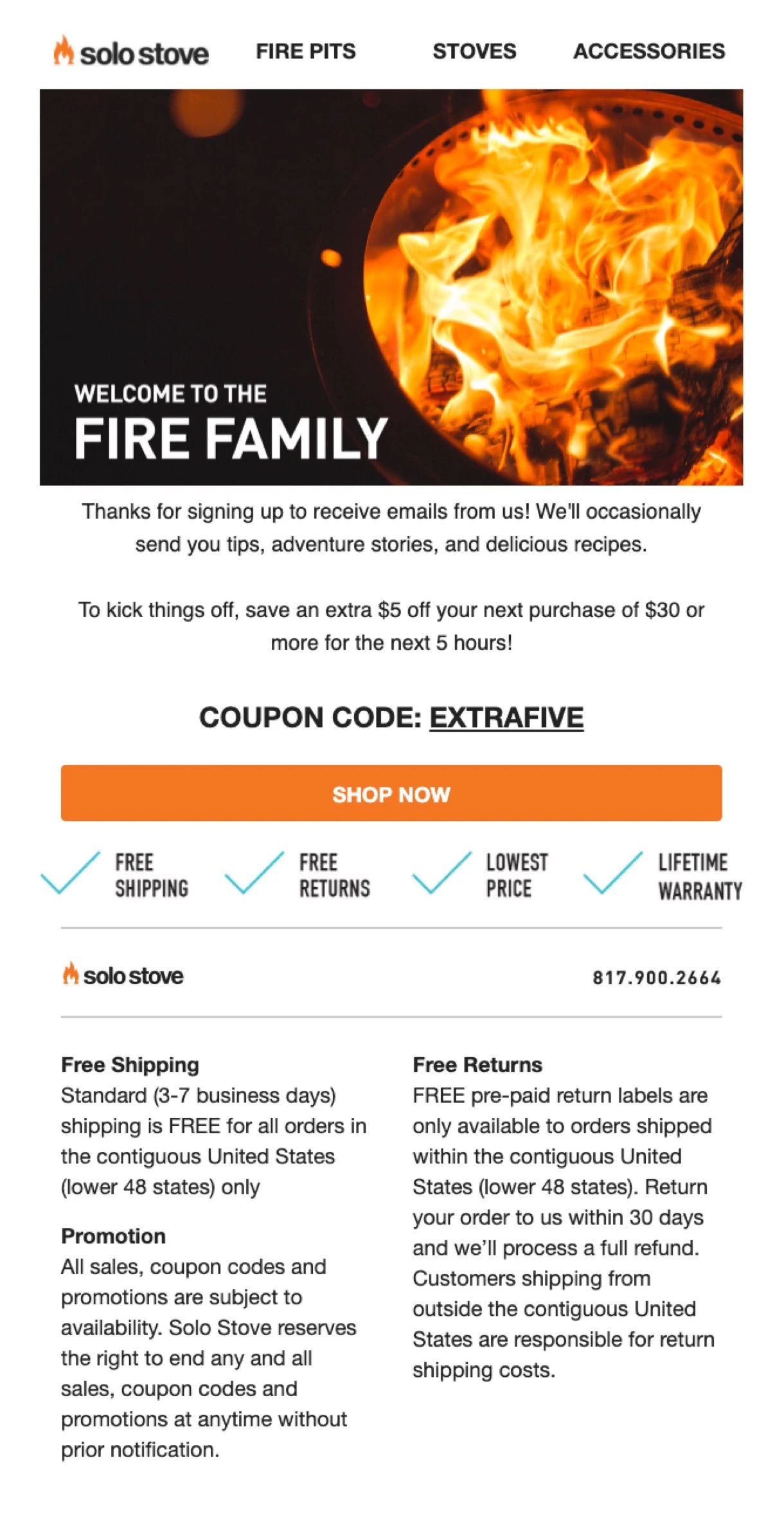 Camping stove company, Solo Stove, stands out with its welcome email by detailing their shipping and return policies.