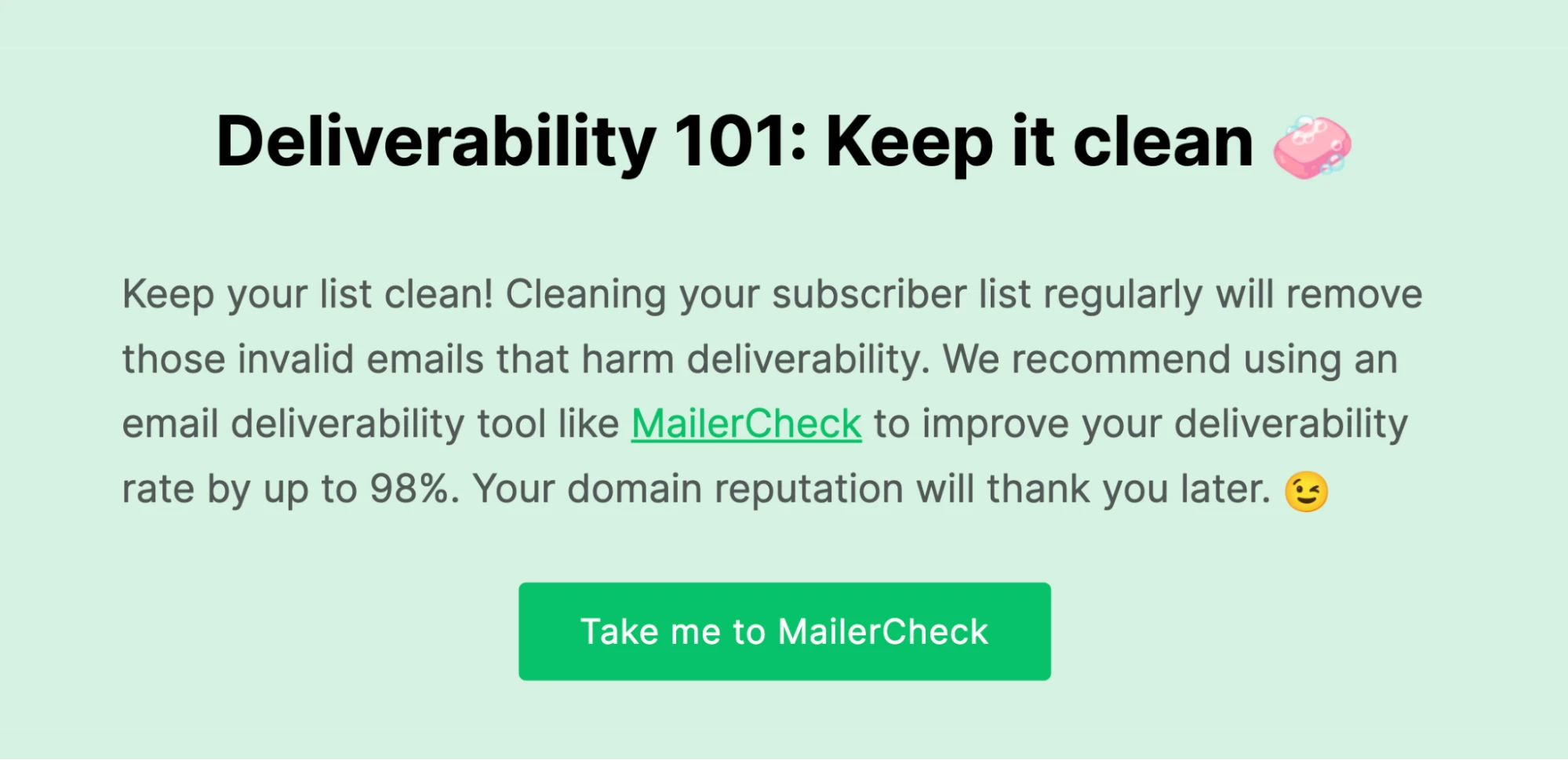 Typically a CTA will be in the form of a button and explainer text. Below is an example from a recent MailerLite email asking people to click on a link to MailerCheck, our suite of email deliverability optimization tools.