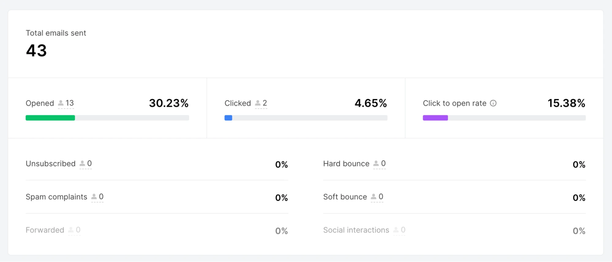Most email marketing tools will track opens and clicks. They’ll also provide data on how individual subscribers interact with your messages.