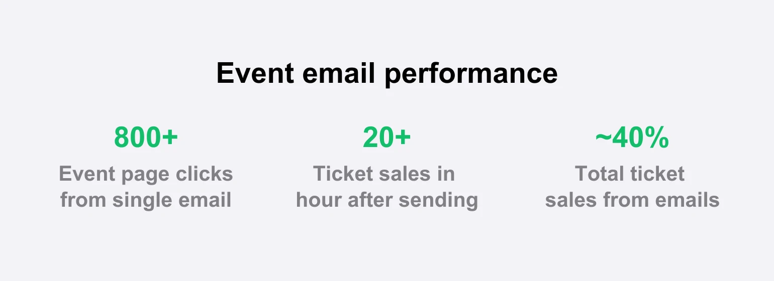 Email marketing was the main strategy she used to generate awareness and sell tickets. It works well because promoting offers in an email list is an effective way to get people to take action with your brand.