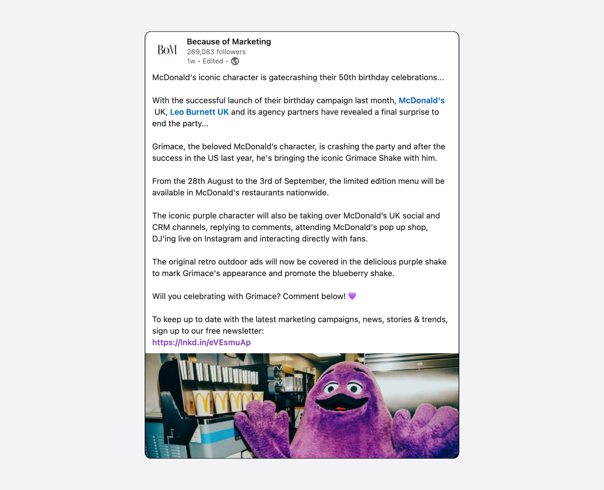 Learn more about Rachael’s business by joining the Because of Marketing newsletter. You can also follow the brand on LinkedIn and Instagram, or her personal account on LinkedIn.