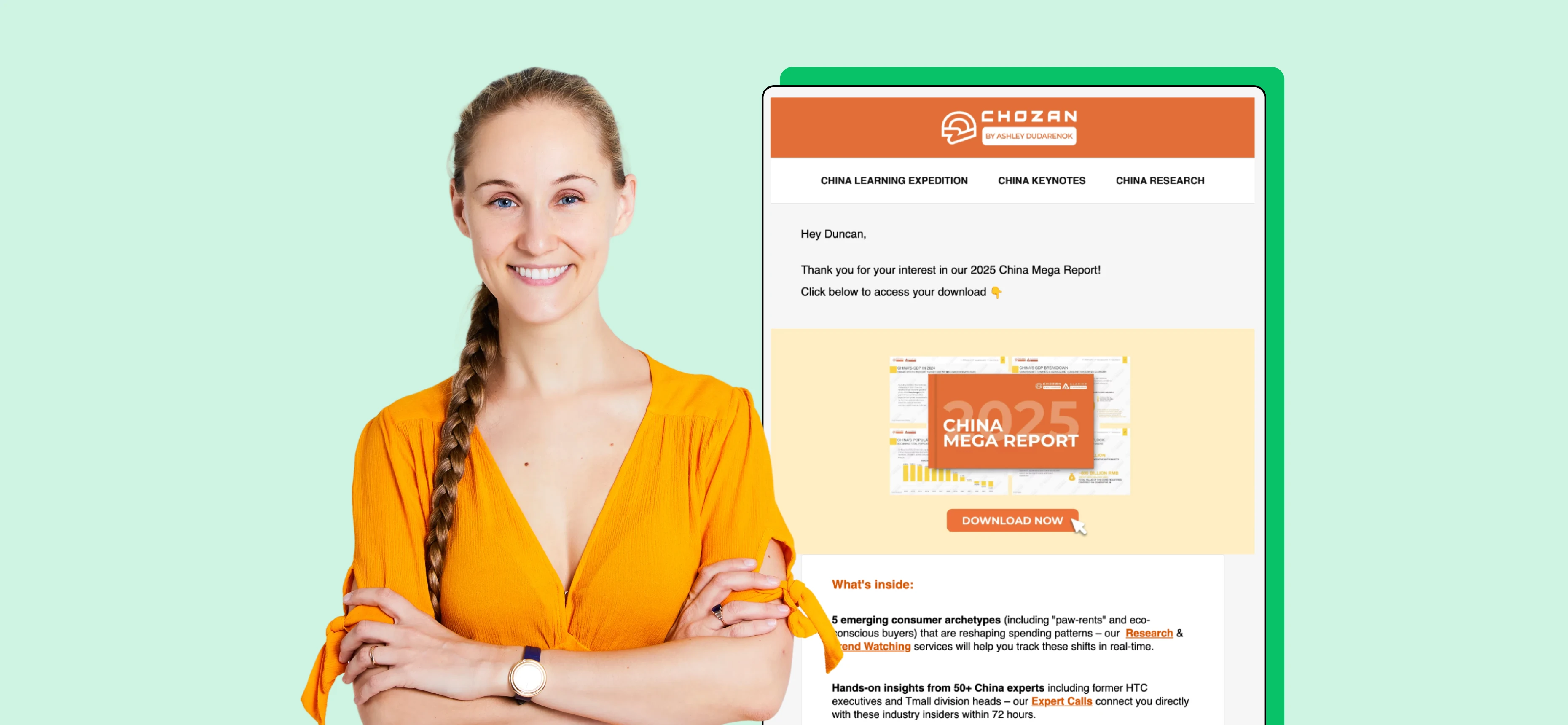 Founder of China research and digital transformation company ChoZan, Ashley Dudarenok, builds this trust with content. She has a strong social presence, publishes in-depth lead magnets, and has a deep dive newsletter that helps her prime leads to buy the brand’s products, including $12,000+ China innovation tours.