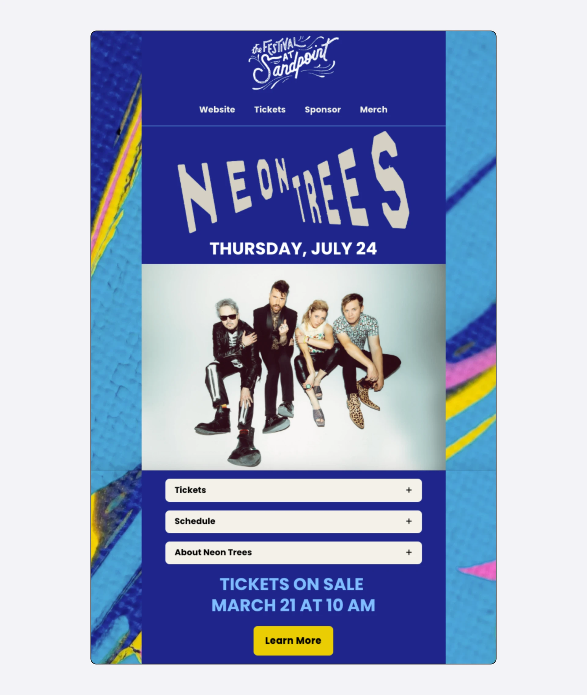 The Festival at Sandpoint sells tickets whenever Cienna sends an email. Thanks to MailerLite’s unlimited email-sending feature, the only limit on the organization’s ability to drive sales is the campaign ideas she comes up with.