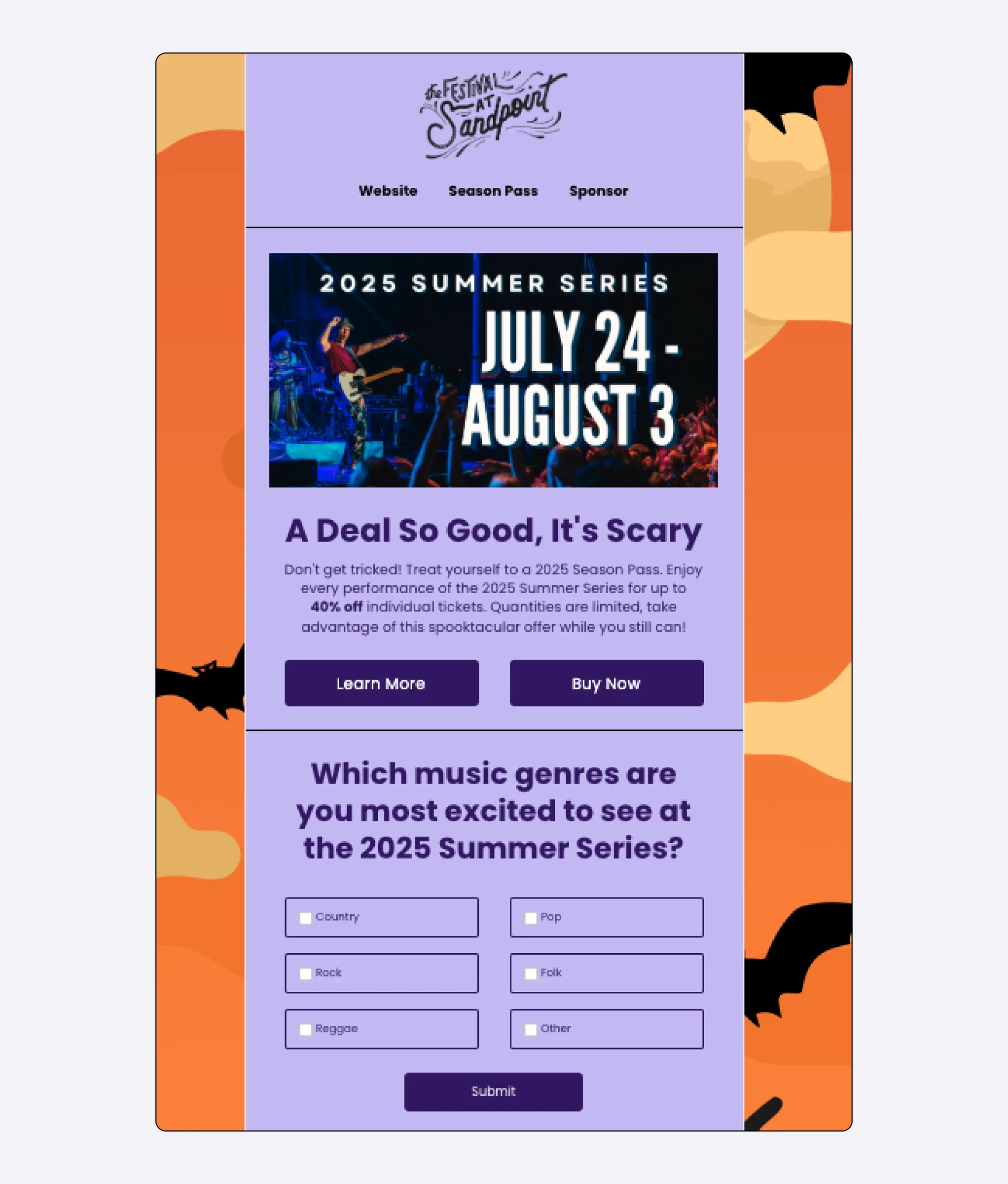 When I first upgraded, I loved the survey feature. Before we announced the concerts, I asked which acts people wanted to see and there were so many responses. I loved seeing this interaction. And I can use the answers to create segments.